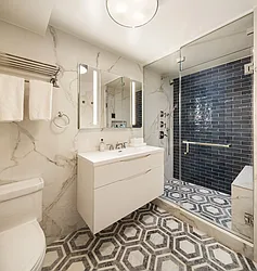 The bathroom is sleek and airy, with a floating vanity, dual mirrors, and a glass-enclosed walk-in shower wrapped in dark subway tile. Marble-like walls and patterned floors add crisp, modern polish.