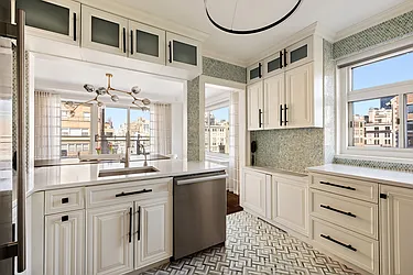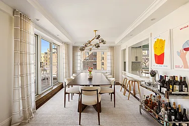 The dining room is bright and airy, framed by large windows with city views and a pass-through to the kitchen, creating effortless flow. Light walls enhance openness and natural light.