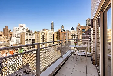 This outdoor space spans a tiled balcony and a spacious tiled terrace with built-in brick planters and city skyline vistas, offering airy urban outlooks over streets, rooftops, and mid- to high-rises.