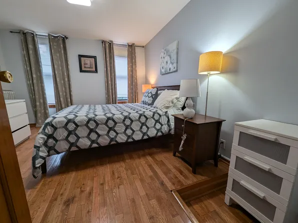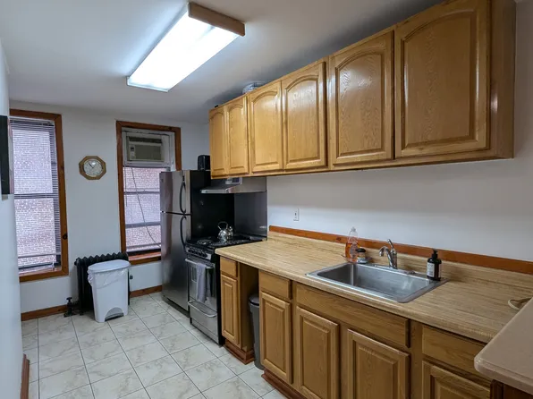 This sunny floor through apartment features hardwood floors, large kitchen with counter space & storage, high ceilings, southern exposure, 1 bedroom will fit a king, the other, if flexed, would fit a queen.