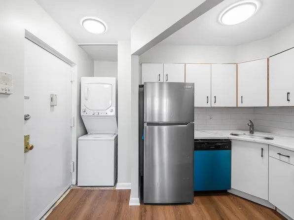 This beautifully appointed loft-like studio features rich hardwood floors, in-unit laundry, central heating and cooling, and oversized windows that bathe the space in natural light, accentuating its clean lines and modern aesthetic.