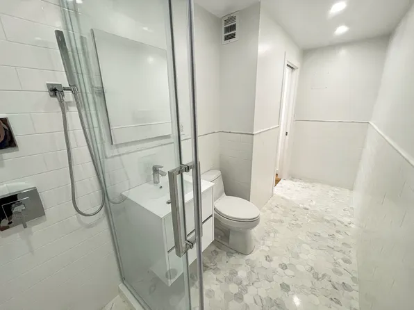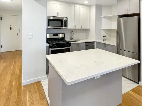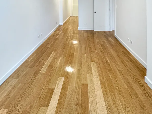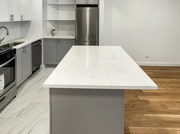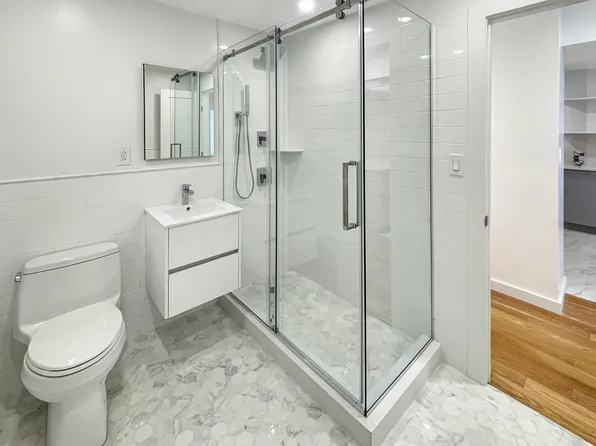 This two-bedroom residence features central heating and cooling, elegant herringbone wood flooring, a full-size in-unit washer and dryer, and thoughtfully designed interiors throughout. The custom kitchen is equipped with a premium stainless-steel appliance package, a marble waterfall breakfast bar, and bespoke cabinetry, complemented by a refined bathroom with spa-like finishes.