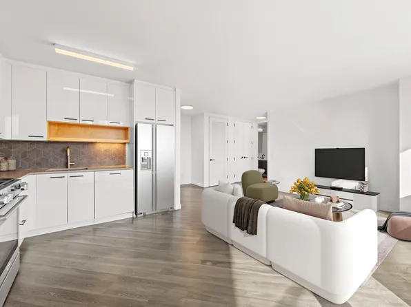 This two-bedroom residence features central heating and cooling, elegant herringbone wood flooring, a full-size in-unit washer and dryer, and thoughtfully designed interiors throughout. The custom kitchen is equipped with a premium stainless-steel appliance package, a marble waterfall breakfast bar, and bespoke cabinetry, complemented by a refined bathroom with spa-like finishes.
