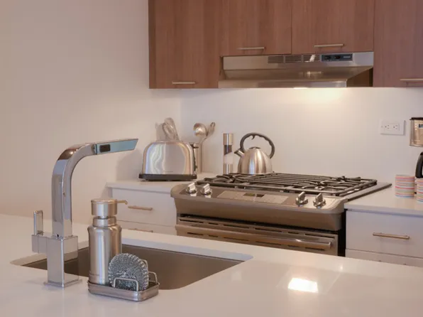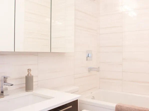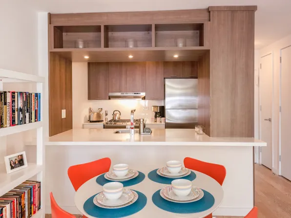 This one-bedroom residence features central heating and cooling, elegant herringbone wood flooring, a full-size in-unit washer and dryer, and thoughtfully designed interiors throughout. The custom kitchen is equipped with a premium stainless-steel appliance package, a marble waterfall breakfast bar, and bespoke cabinetry, complemented by a refined bathroom with spa-like finishes.
