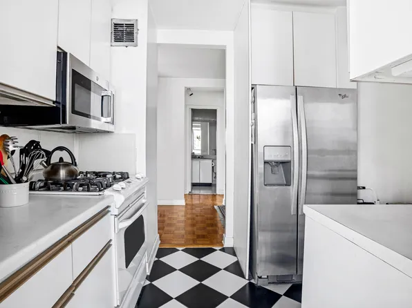 Upon entering, the foyer leads to a spacious formal dining/living room. The windowed chef’s kitchen features full sized stainless steel appliances, dishwasher, and an abundance of cabinetry. All three South facing bedrooms overlook the common garden and are showered by great natural light.