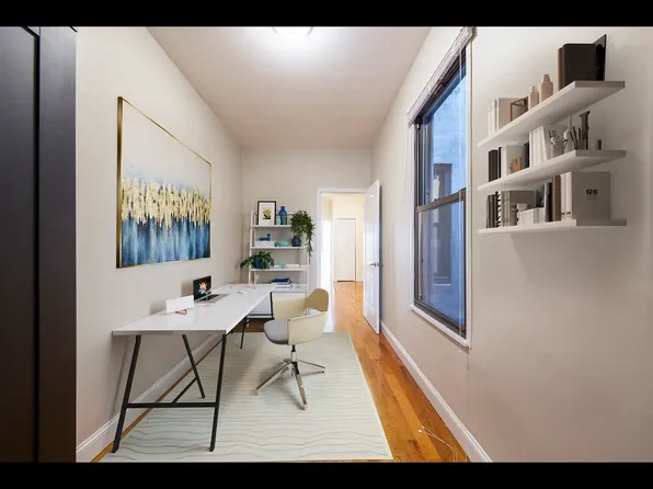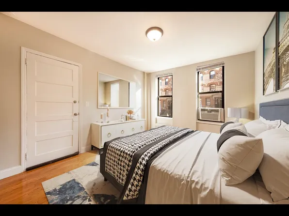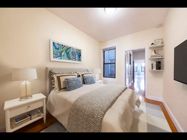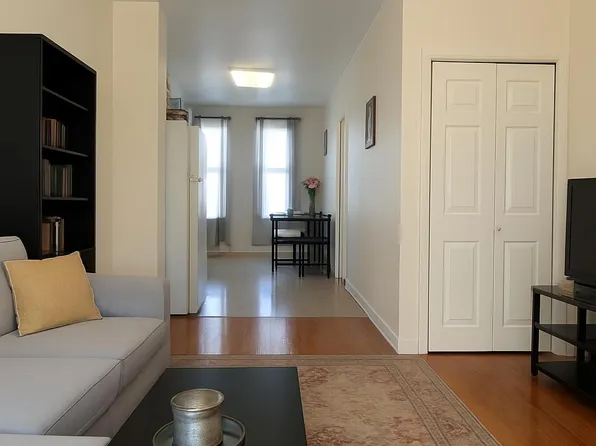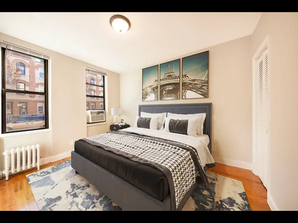 The apartment is in very good condition with hardwood floors throughout, generous natural light, and a practical layout that works well for couples, small families, or roommates who are comfortable with a pass-through configuration.
