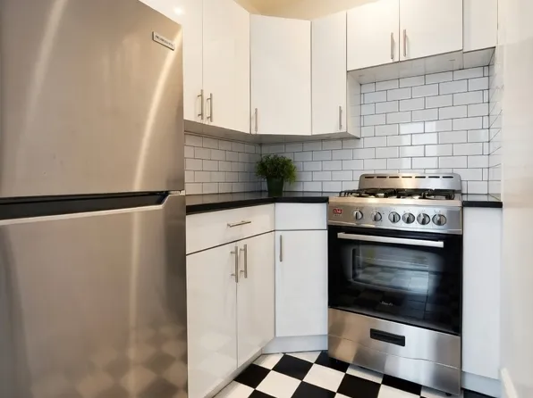 Modern Kitchen: Newly updated kitchen, featuring a sleek tile backsplash and brand-new stainless steel appliances.