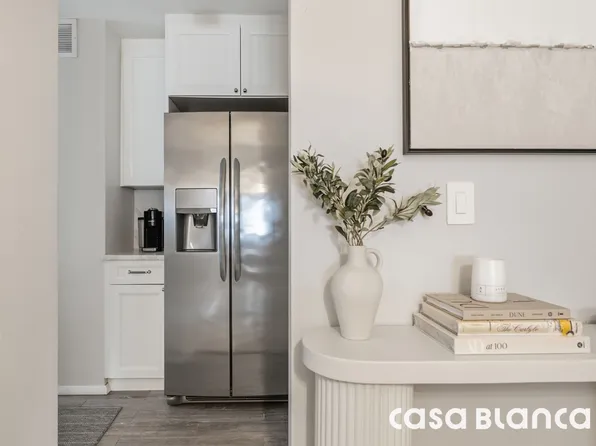 The thoughtful renovations include a stunning chef’s kitchen equipped with a high-end Bosch appliance package, sleek waterfall quartz peninsula with bar seating, custom cabinetry, and antiqued stone flooring.