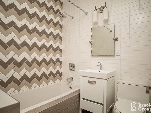 This gut-renovated two-bedroom apartment combines modern updates with classic details. It features ebony hardwood floors throughout and an open kitchen with stainless steel appliances and Carrara marble countertops. Additional details include recessed lighting, crown molding, exposed brick, and oversized windows that bring in plenty of natural light.