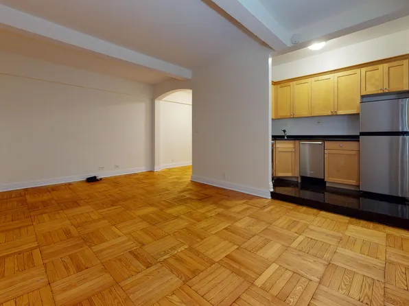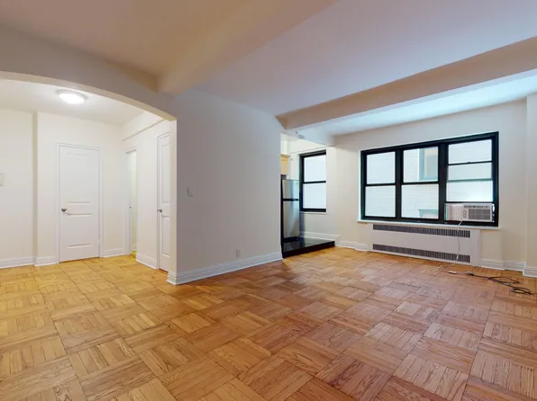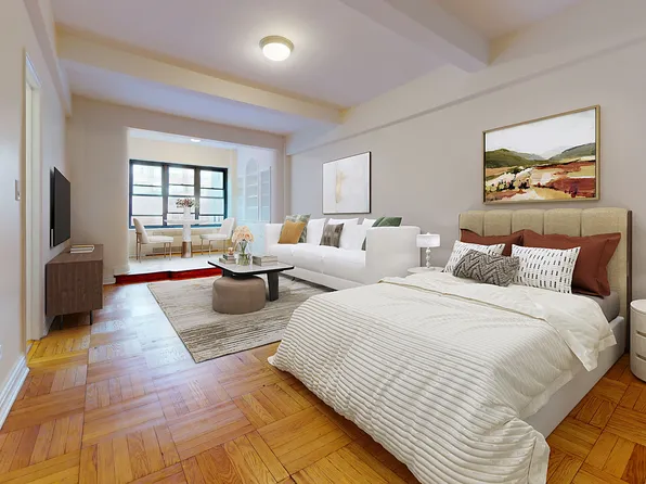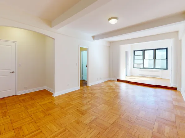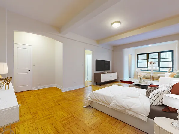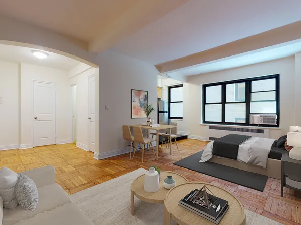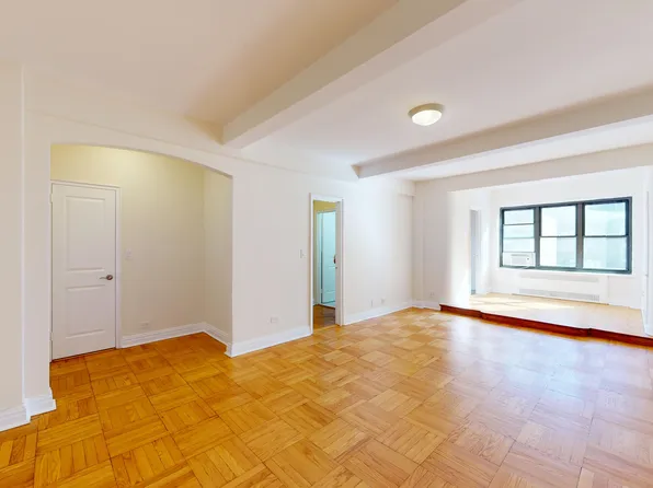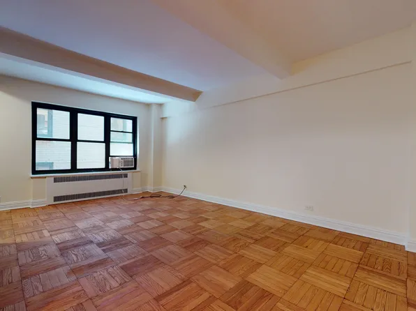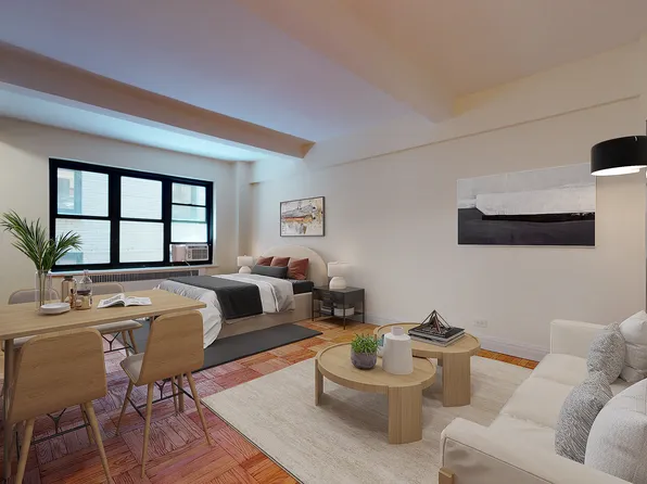 This enormous alcove studio is located on a beautiful street in Midtown East close to the UN and Grand Central. It is approx 600SF on a high floor with a huge wall of windows overlooking a park. Very sunny and amazing views! Can easily fit a king size bed, sectional couch, dining table and office.