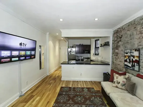 A central living room with an exposed brick wall opens to a chef's kitchen and breakfast bar. There are hardwood floors, high ceilings and recessed lighting. The kitchen features all new stainless steel appliances including a gas range, dishwasher and microwave.