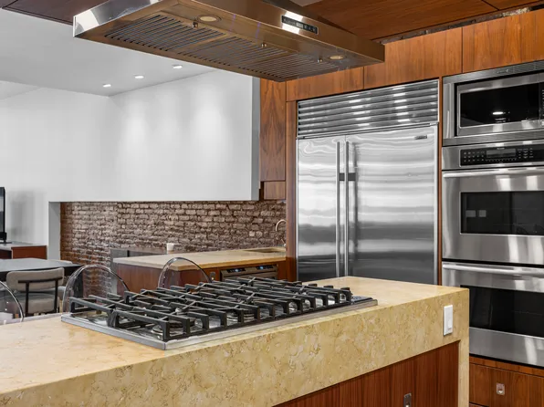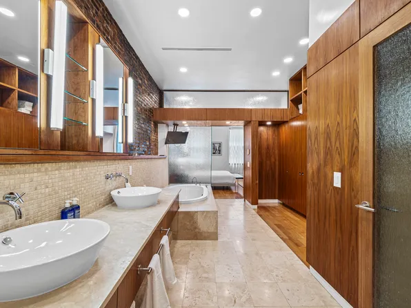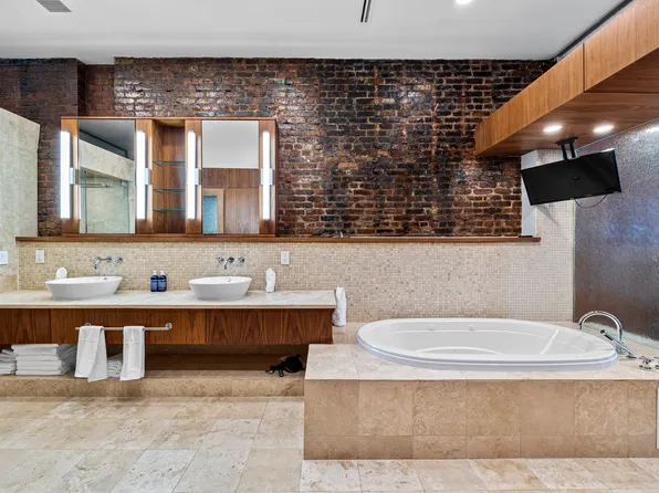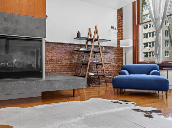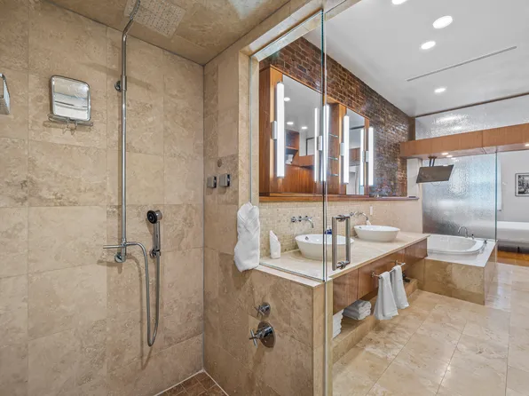 A key-locked elevator opens directly into a spectacular west-facing 42’ x 25’ great room, bathed in natural light through floor-to-ceiling windows. This dramatic entertaining space features exposed red brick, a wood-burning fireplace, and voluminous ceilings that capture the quintessential Tribeca loft aesthetic.