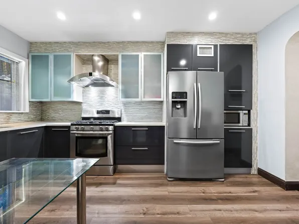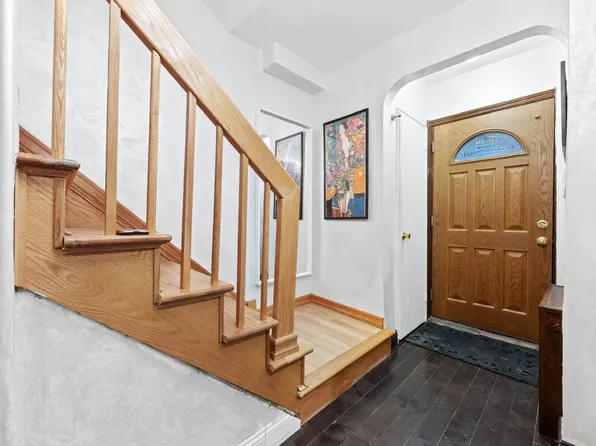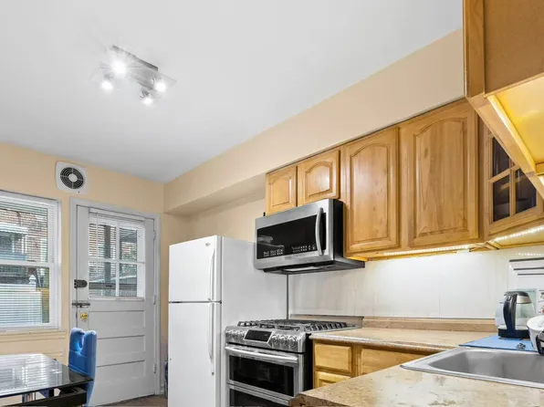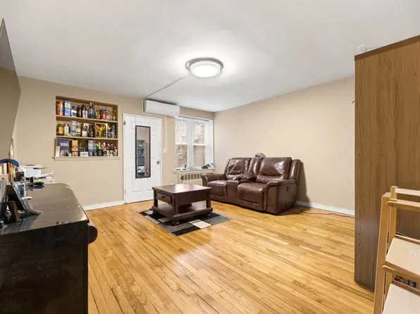 This semi-detached four-bedroom, two-bath residence offers 1,583 square feet of interior space across two units — a railroad-style layout on the lower level and a more traditional plan above, each with private entrances.