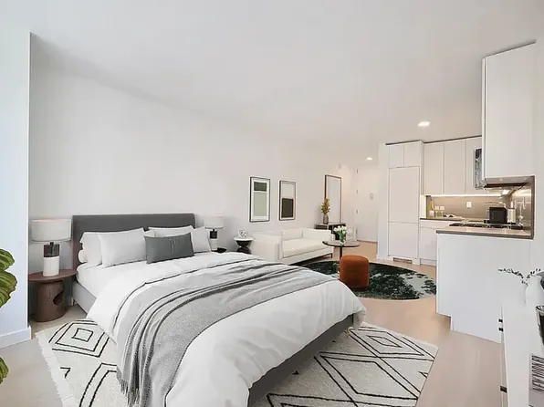 Step into this sun-drenched, expansive loft studio, boasting a lofted bed area with captivating Empire State Building vistas through a grand, south-facing window. This generously proportioned loft apartment boasts soaring 12-foot ceilings, an open-plan kitchen outfitted with sleek stainless steel appliances, an elevated sleep space, and an abundance of closet storage.