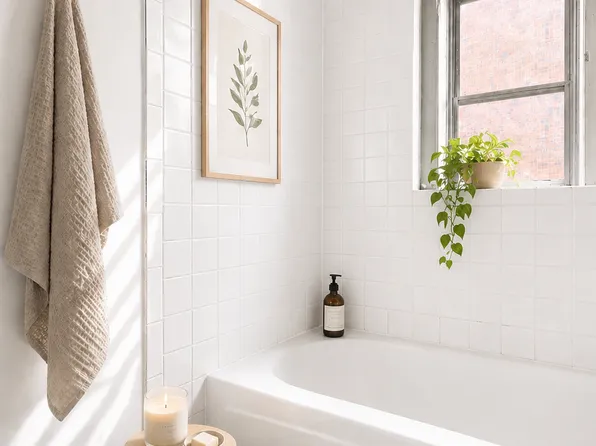 Relax in the spa-style bathroom and admire the charming exposed brick walls that add character to the space.