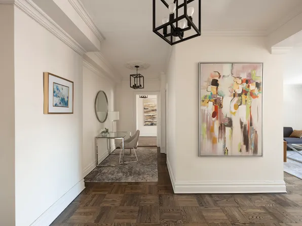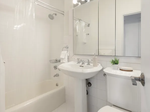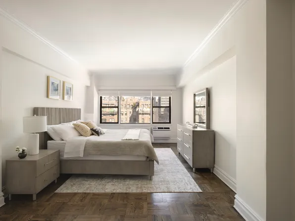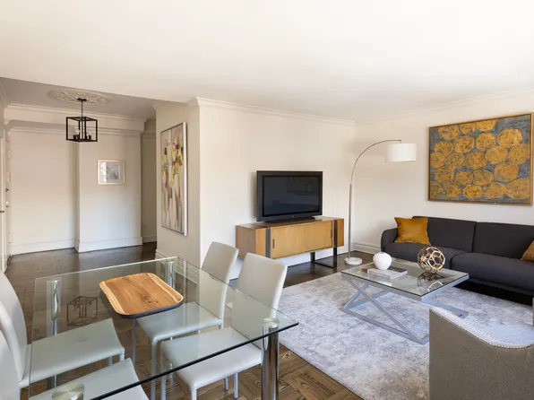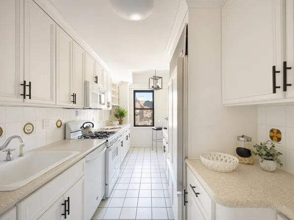 Classic, authentic New York. 2 Bedroom, 2 Full Bath apartment in an Emery Roth designed and Bing and Bing constructed prewar Beekman neighborhood building. Apartment 7A features a gracious entry foyer with 2 large closets, leading into the dining area and an office nook. A cheerful, renovated, windowed kitchen has stainless appliances, dark wood cabinets and a gleaming white countertop.