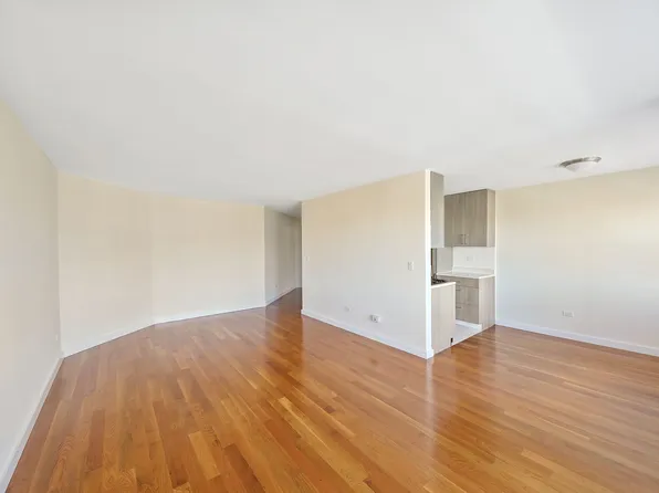 Classic one bedroom with an open living room and kitchen and a walk-in closet in the bedroom.