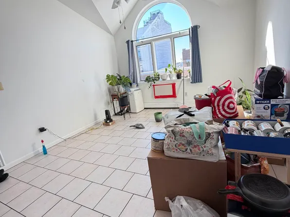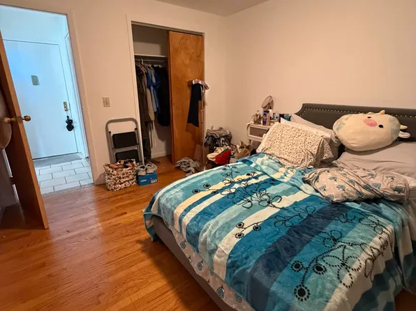This super bright, junior 1 bedroom apartment (2 room studio + bathroom) features a separate eat-in-kitchen with lots of cabinets, plenty of counter space for prep work, and a huge closet/pantry. The spacious bedroom can fit a king-size bed and has floor to ceiling closets that span the entire length of the bedroom wall.