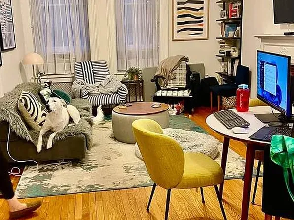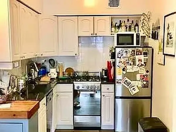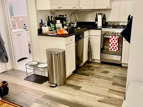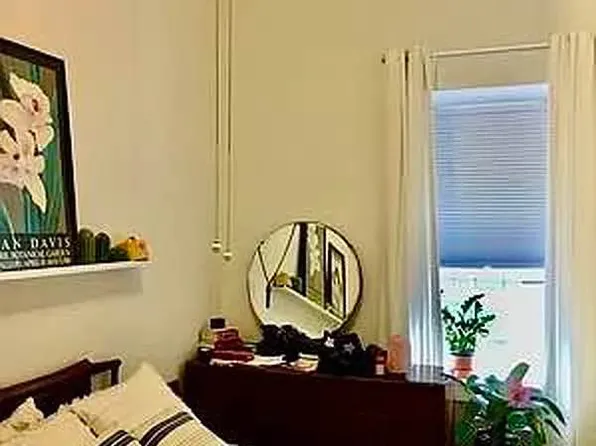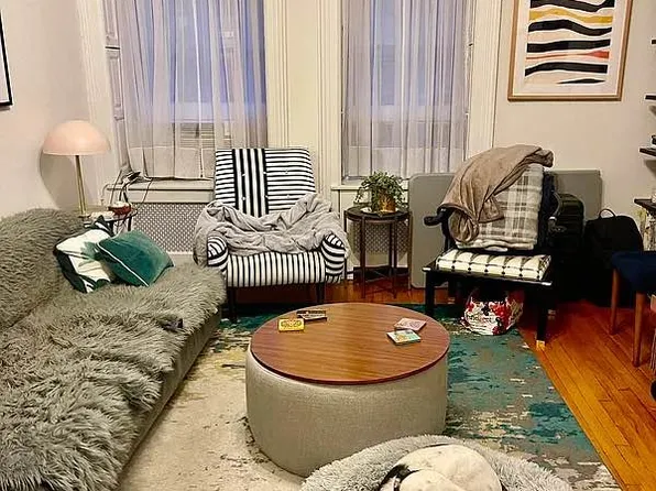 Living room is nicely sized with two large windows that get a lot of light. Kitchen has an island that is open to the living room. Large bedroom. The bedroom window faces the interior shaft of the building. If you need a dark room to sleep in it’s perfect.