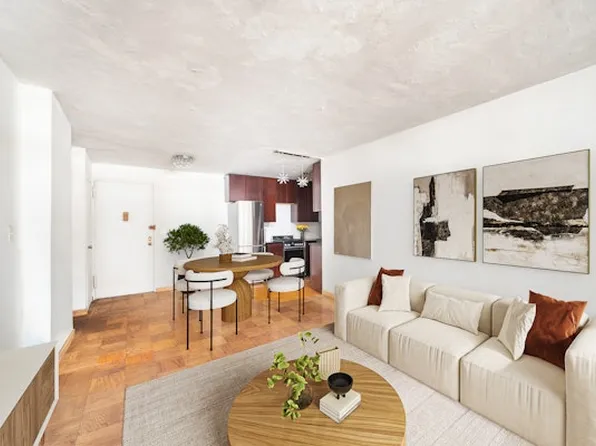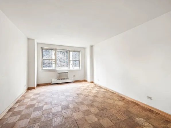 A split convertible 2 bedroom, 1 bath home in a full service Coop with open Northern views and abundant light. Perfect for entertaining, the large open living room enjoys a set of glass paned pocket doors opening to a den/office or second bedroom with its own closet and ceiling fan. A pass-through windowed kitchen with white Hotpoint appliances and built in wine storage rack below the counter opens to the spacious living/dining area with North & East exposures.