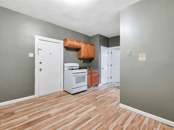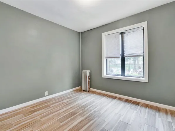 The studio room has a full closet, parquet wood flooring, and two windows with original wood moldings. The windowed eat-in kitchen has ample cabinetry, laminate flooring, and space for a dinette table and chairs.