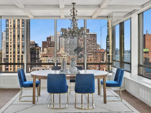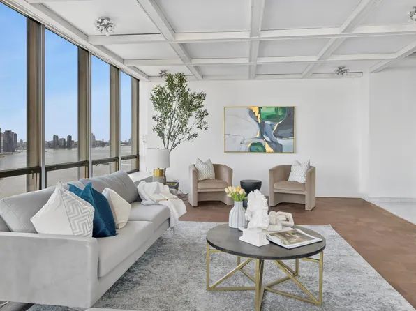Pied-a-terres are welcome in this sophisticated residence nestled in a serene cul-de-sac with delightful peeks of the East River. This exquisite 2 bedroom (flex 3 bedroom) and 3 bath jewel offers a harmonious blend of classic charm and modern conveniences, making it a rare find in the heart of New York City.