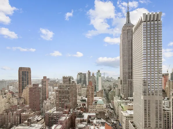 Experience iconic city views in this sun-filled two-bedroom, two-and-a-half-bathroom condominium at 45 Park Avenue, designed by architect Costas Kondylis. This 1,494-square-foot home features floor-to-ceiling windows, Juliet balconies, and 11-foot ceilings, offering breathtaking skyline vistas of the Empire State and Chrysler Buildings.