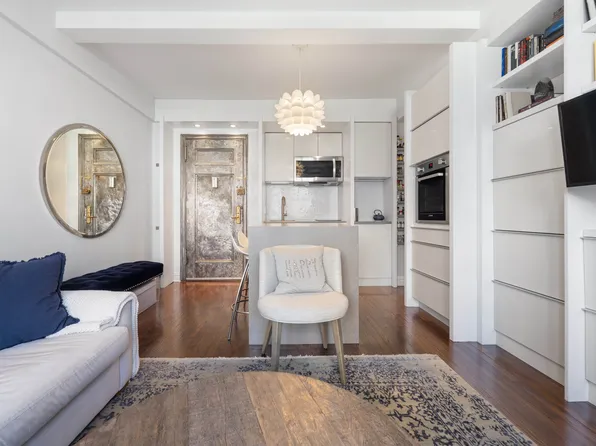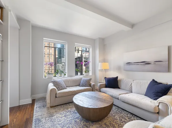 The spacious corner living room benefits from the Tudor City Green and city view with the Chrysler & Summit building while being flooded with natural light due to dual exposures.