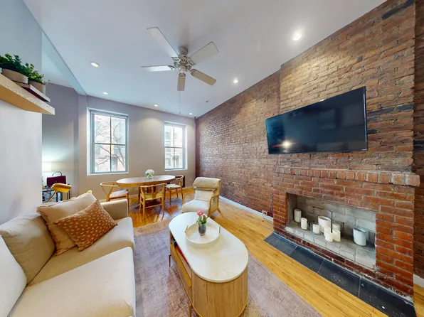 This charming 1-bedroom, 1-bathroom residence, located on the third floor of a landmarked townhome, masterfully blends classic elegance with modern convenience. The home features a cozy wood-burning fireplace and exposed brick walls, adding warmth and character to the inviting living space.