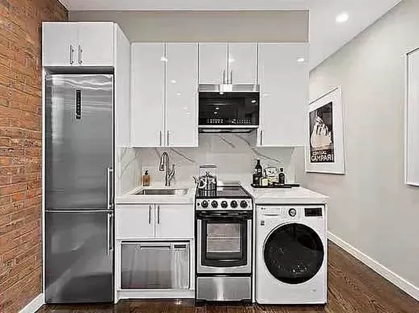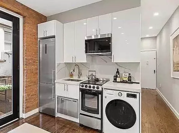 This newly renovated three-bedroom apartment in the heart of the East Village boasts a spacious living room with an open kitchen. The kitchen is equipped with high-end stainless steel appliances, including an LG refrigerator, a Bosch dishwasher, a range and oven, complemented by stone countertops and a subway tile backsplash.