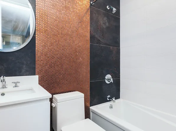 The renovated bathroom includes a deep tub and industrial-chic lighting.