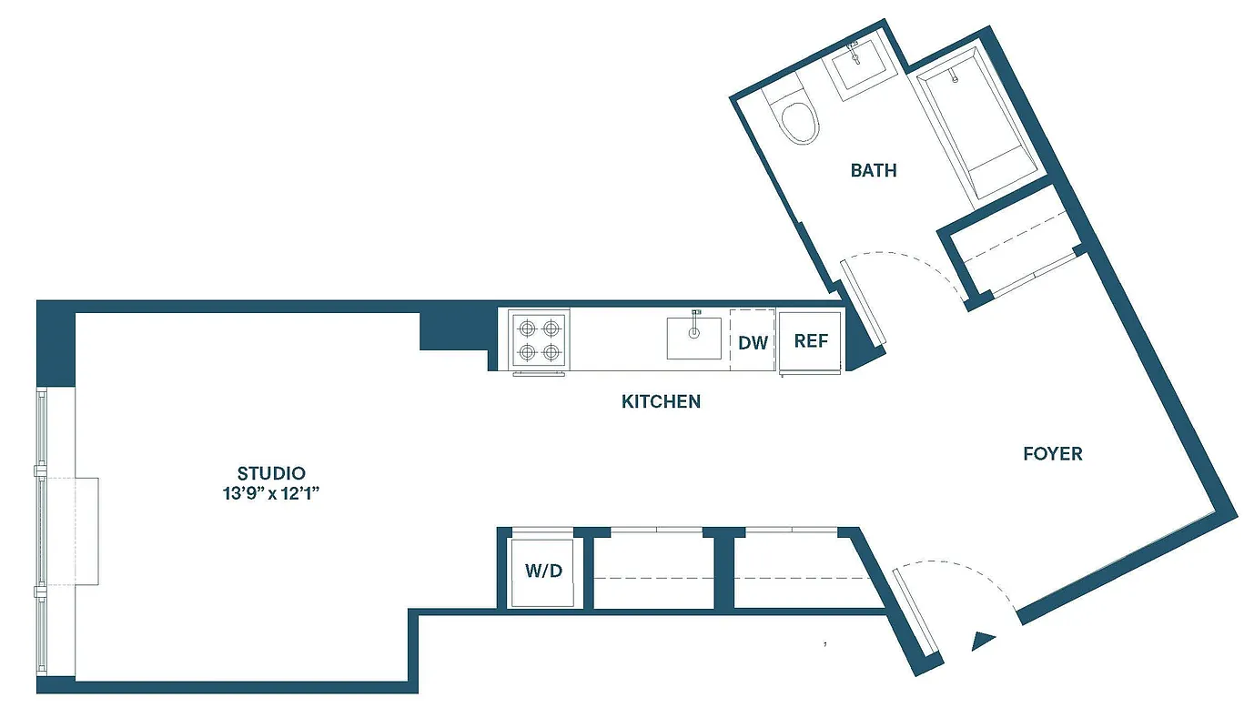 Spacious studio with flexible layout that includes bonus foyer space. This incredibly livable apartment has extra space for a separate sleeping area, or home office space, etc. Apartment also features an in-unit washer/dryer, multiple closets, wood floors throughout, and a distinctive open gourmet kitchen with blue-grey lacquered cabinets, stainless steel appliances, and caesarstone countertops.