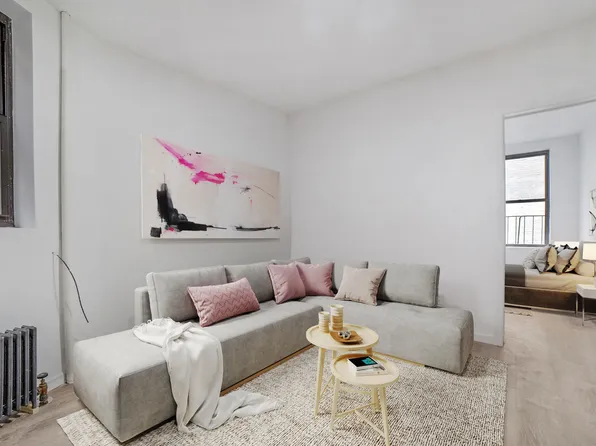 This apartment, only 4 short flights up, features 9’ ceilings, floor-to-ceiling windows, a dining area, functional kitchen, and a renovated bathroom.