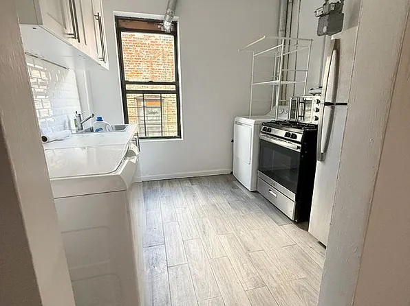 This is a modern 1 Bed, 1 Bath unit. With Floor to Ceiling Windows. It includes Oversized Windows, recessed lighting, white tiled floors, Stainless Steel Kitchen Appliances, Dishwasher, Microwave, and a deep soaking tub in the bathroom. Washer/Dryer in unit. The building has a common roof deck, paid parking space available, and is located just a few blocks from the B/C/2/3 train