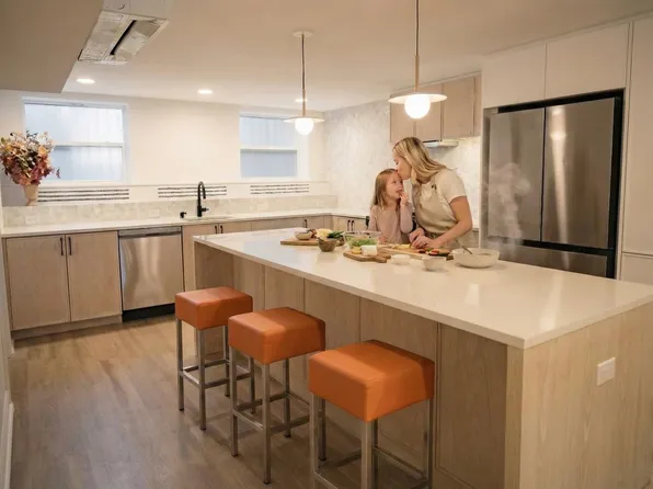 Renovated open kitchen with a 36" Subzero refrigerator, 6-burner Wolf range, Bosch dishwasher, and custom cabinetry-perfect for entertaining or even content creation.