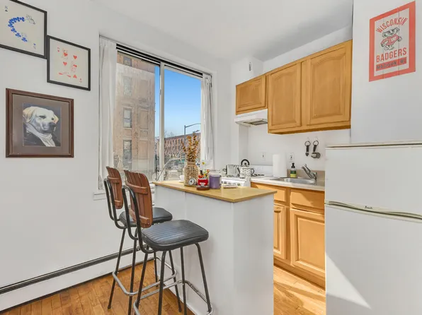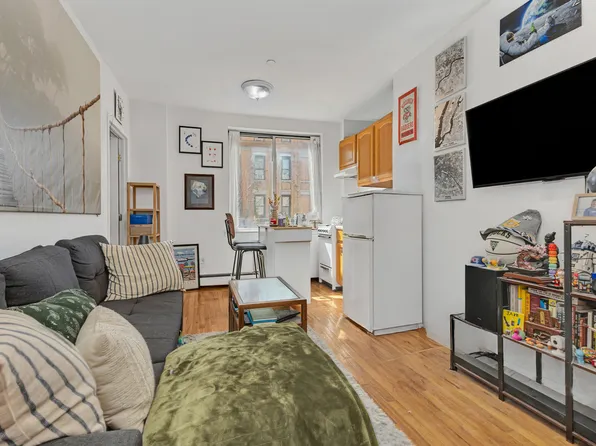 The apartment, located on the fourth floor, features a queen-sized bedroom with closet and two large windows; a true living room; open kitchen with Caesarstone quartz countertops, GE stainless steel appliances including dishwasher and microwave, and custom cabinetry; renovated tile bathroom with slate flooring and high-end fixtures; high ceilings.