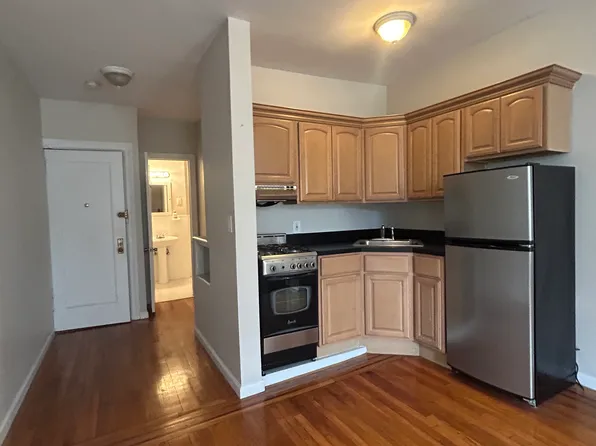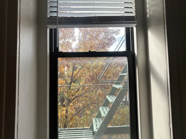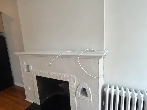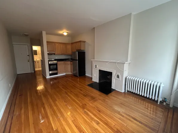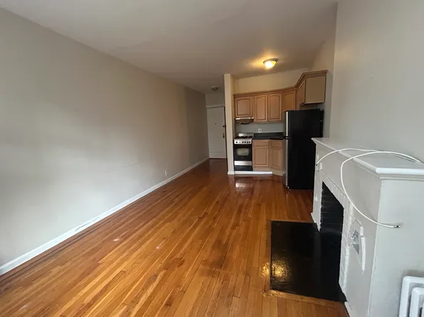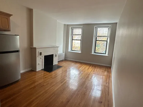 Huge living room featuring hardwood floors, exposed brick *working fireplace, 2 gorgeous south facing windows with village and skyline views , high ceiling and updated kitchen with stainless steel fridge and stove