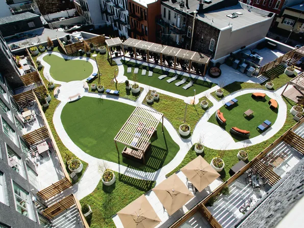 597 Grand boasts stunning views, roof access, kids playroom, coworking, gym and more!