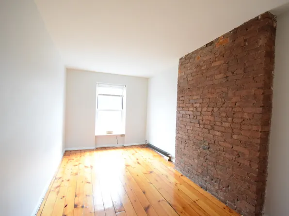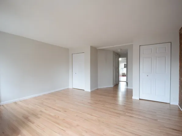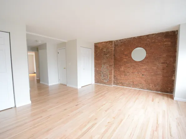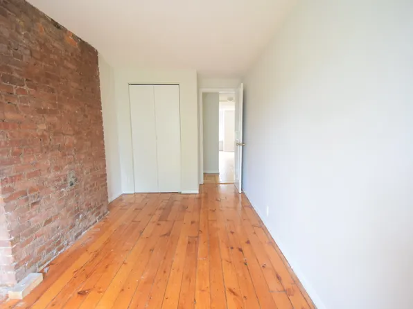 Exposed brick walls throughout the apartment. The apartment has a bunch of closets with overhead sections.