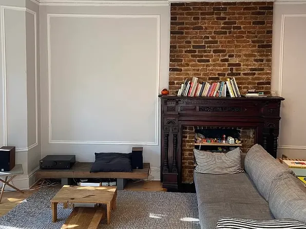 Apartment features a dishwasher, exposed brick, decorative fireplace, ornate ceiling medallions and four closets total.