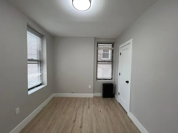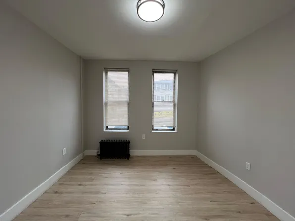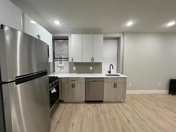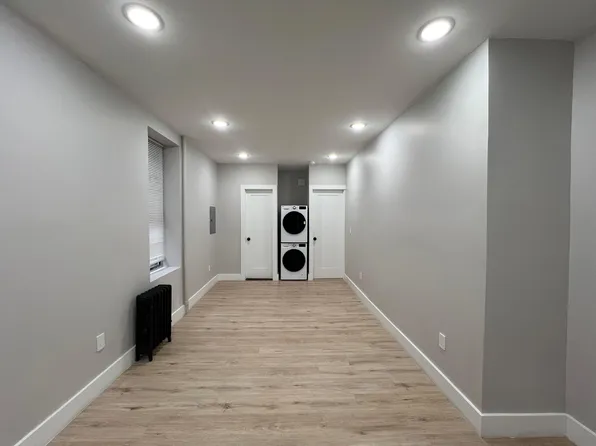 Charming 2 bedroom in brick row home on quiet tree lined street in great Journal Square neighborhood. Walk into the duplex unit which features a great size living area, large eat-in kitchen with stainless steel appliances and full-size bath. Beyond this is a laundry/office area that leads out to a well-manicured private backyard lined with lush trees for ultimate privacy.
