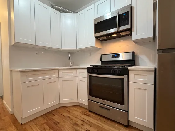 Large boxed 2 bedroom apartment in Bushwick. Enter into the large open living room which is spacious enough for a separate home office. Off of the living room is the dining room with and open floor plan to the kitchen. The kitchen features lots of cabinet space and a full appliance package featuring dishwasher and microwave. The dining room could also double as an extra home office.