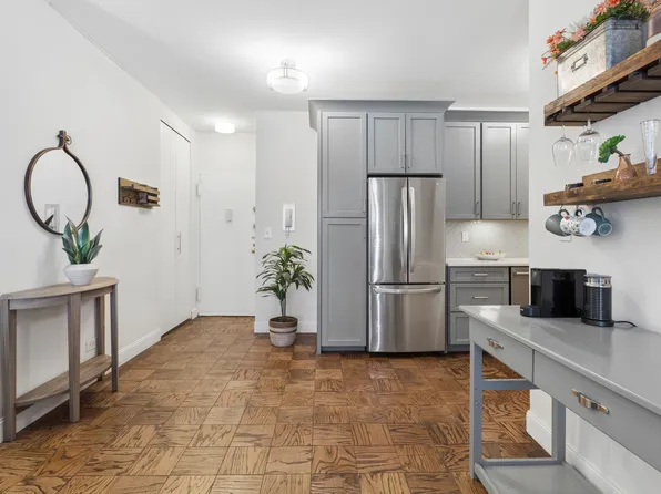 Unit 3C features a formal entry foyer that opens into a spacious living area with room for distinct seating, dining, and work-from-home zones. The renovated kitchen is outfitted with white cabinetry and stainless steel appliances, including a gas range, full-size dishwasher, refrigerator, and built-in microwave.