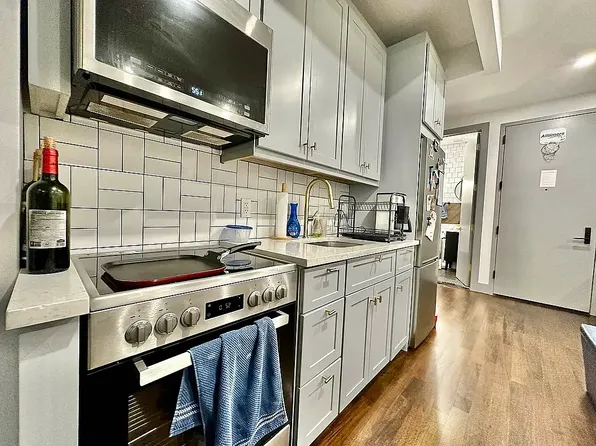 - Renovated kitchen: gray shaker cabinets, green subway tile backsplash, stainless steel appliances, dishwasher, gas range