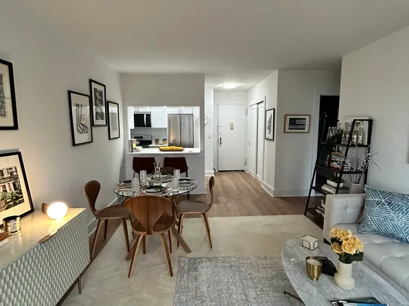 Welcome to Residence 6E at 865 United Nations Plaza, a refined one-bedroom retreat where prewar charm meets modern comfort. A gracious entry foyer opens to a sun-filled living room with south and west exposures, framing treetop views, the East River, and the iconic United Nations. A separate dining alcove provides the perfect setting for meals or entertaining, while high-beamed ceilings, decorative moldings, and original hardwood floors showcase the timeless character of this home.