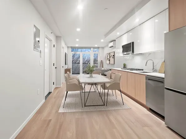 - Modern kitchen with stainless steel appliances, including dishwasher