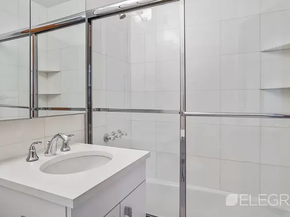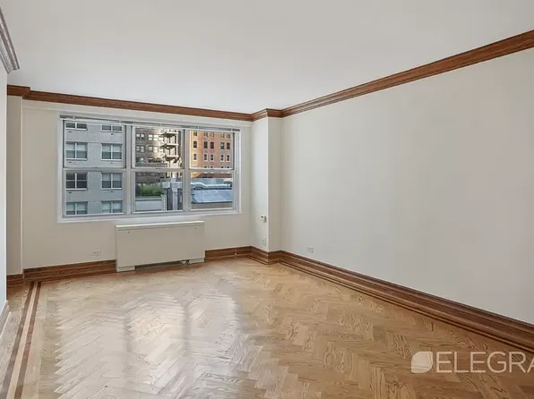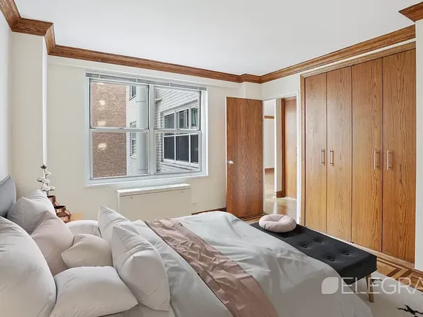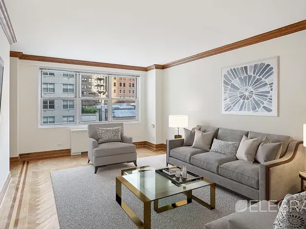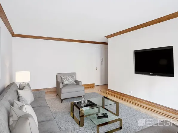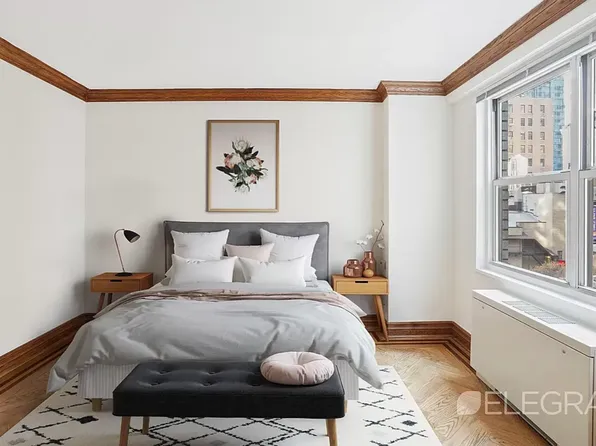 This newly renovated one-bedroom apartment in Columbus Circle is a must-see! The north-facing 6B unit boasts custom closet space, a fully renovated kitchen and bathroom, and double pane windows. The bedroom features a spacious queen-size bed and HVAC unit. while the living area easily fits a sectional sofa, dining table, and coffee table.