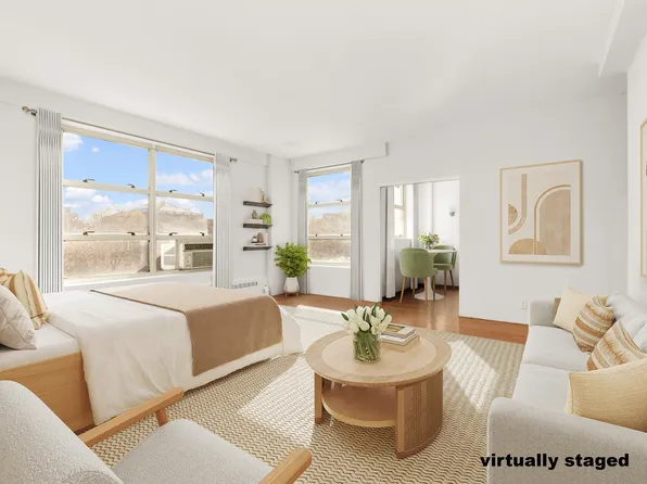 Wonderful Large studio with a renovated kitchen and partially renovated bathroom. Views onto luscious gardens bringing in tons of sun. The coop is within a complex of 6 buildings called Morningside Gardens, with hills and trees, benches a super place to call home.