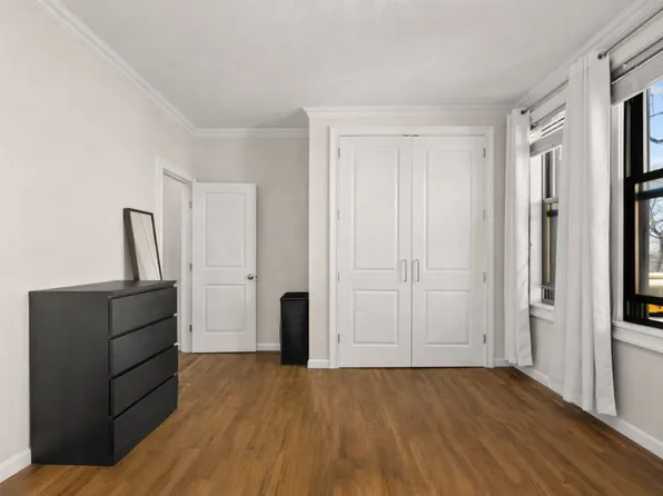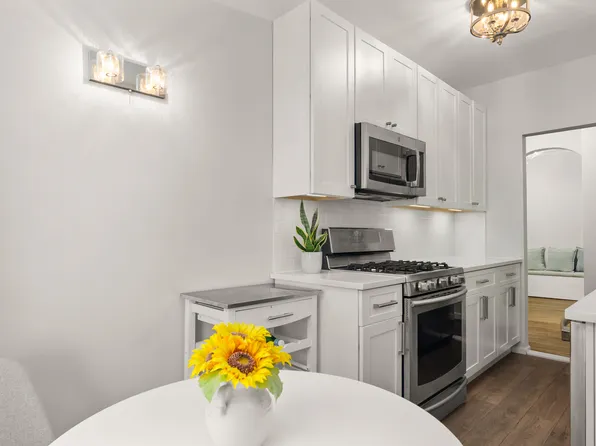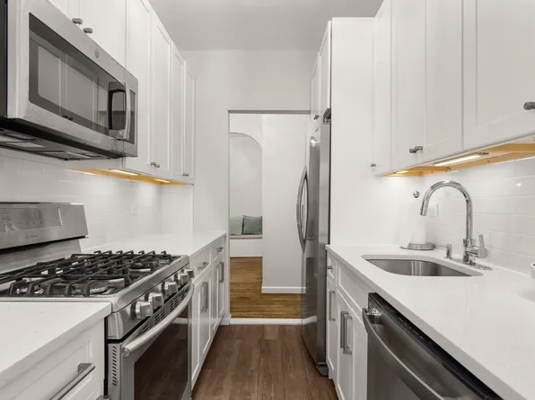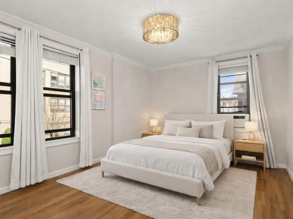 This high-floor, oversized one-bedroom spans approximately 1,000 square feet and offers a gracious layout with three exposures, abundant natural light, views of the Verrazano Bridge, tall ceilings, arched entryways, hardwood floors, and six custom closets.