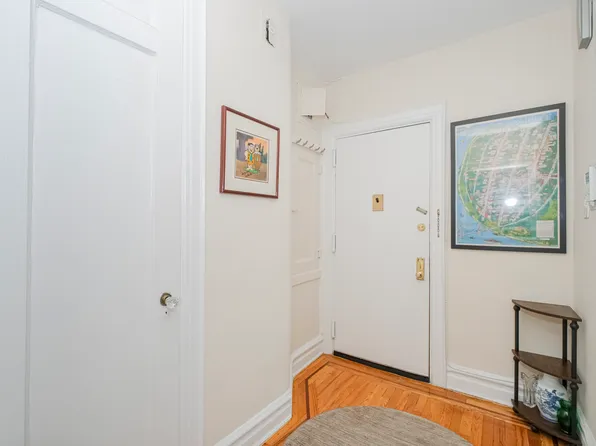 Apartment E4 features high ceilings, eight windows with two exposures, and a generously proportioned floor plan with four closets to ensure a lifestyle of gracious living. The sizeable entry foyer functions as a dining room or home office, opening onto the original 1940's kitchen with a new GE stainless steel gas range and refrigerator.